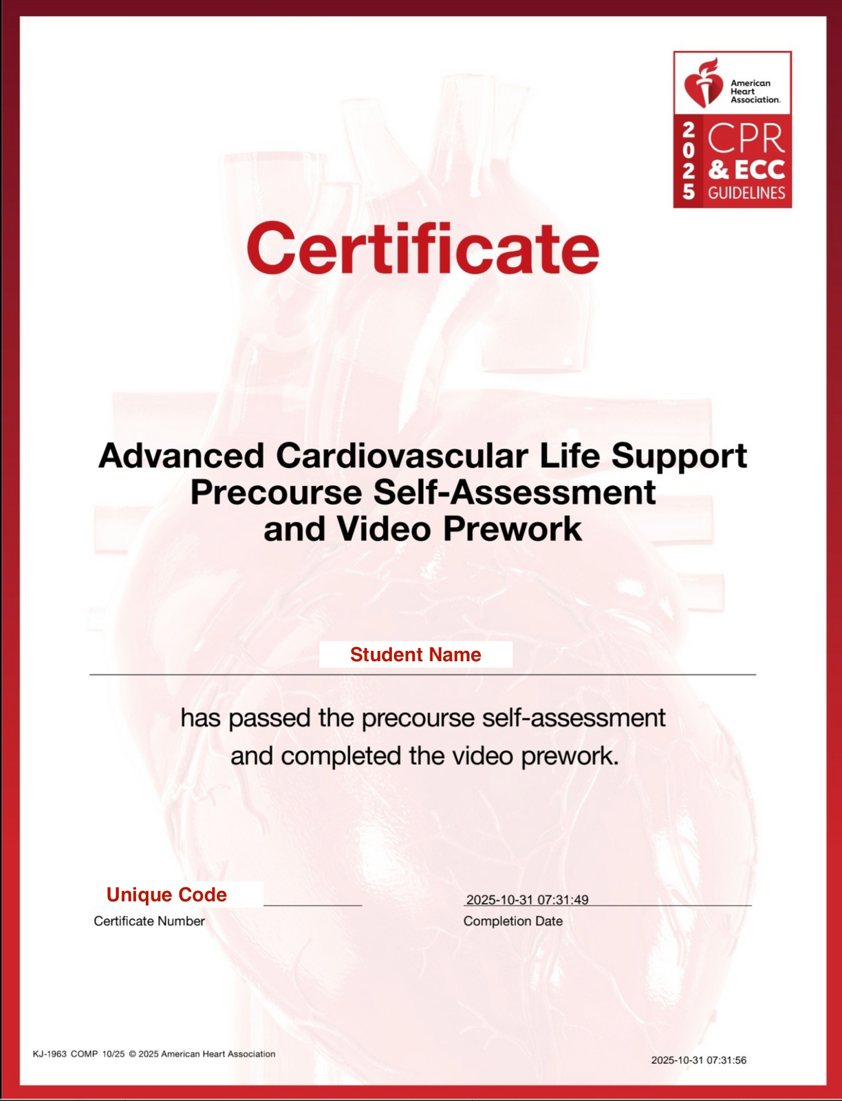 "Before class, read the ACLS Provider Manual, complete the mandatory prework in the ACLS Student Resources (accessed via eLearning.heart.org), identify any gaps in your knowledge, and remediate those gaps by studying the applicable content in the ACLS Provider Manual or other supplementary resources, including the ACLS Student Resources. you must pass the ACLS Precourse Self-Assessment with a minimum score of 70%. You may retake the self-assessment as often as needed to pass. Print your certificate of completion and score report and bring them with you to the course.